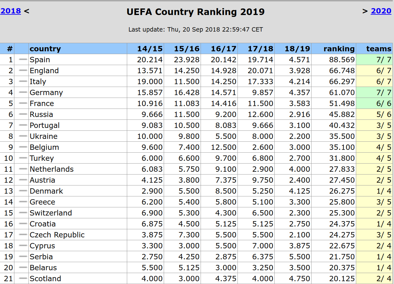 Στην κορυφή της κατάταξης της UEFA, εξακολουθεί βέβαια να βρίσκεται η Ισπανία (7 ομάδες) με 88.9569 βαθμούς, αφήνοντας δεύτερη την Αγγλία (6 από τις 7 ομάδες) με 66.748 και τρίτη την Ιταλία ( 6 από τις 7 ομάδες) 66.297 βαθμούς.