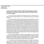 Στην επιστολή με ημερομηνία 9 Οκτωβρίου, προς τον πρόεδρο της Γενικής Συνέλευσης του ΟΗΕ Αντόνιο Γκουτέρες, o Φεριντούν Σινιρλίογλου αναφέρεται σε δήλωση του Έλληνα μονίμου αντιπροσώπου και σε δηλώσεις του Έλληνα πρωθυπουργού, Κυριάκου Μητσοτάκη στην 74η Γενική Συνέλευση και ισχυρίζεται πως «το Κυπριακό δεν είναι θέμα “εισβολής” ή “κατοχής” αλλά ζήτημα της ανανέωσης της συνεργασίας μεταξύ των συνιδιοκτητών του νησιού, που καταστράφηκε από την ελληνοκυπριακή πλευρά το 1964».