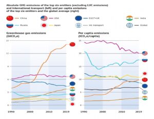 Δεδομένα για τις έξι μεγαλύτερες χώρες που εκπέμπουν αέρια θερμοκηπίου, εξαιρουμένων των εκπομπών από τη χρήση γης και τις μεταφορές παγκοσμίως, σε απόλυτους όρους (αριστερά) και σε κατά κεφαλήν όρους (δεξιά).